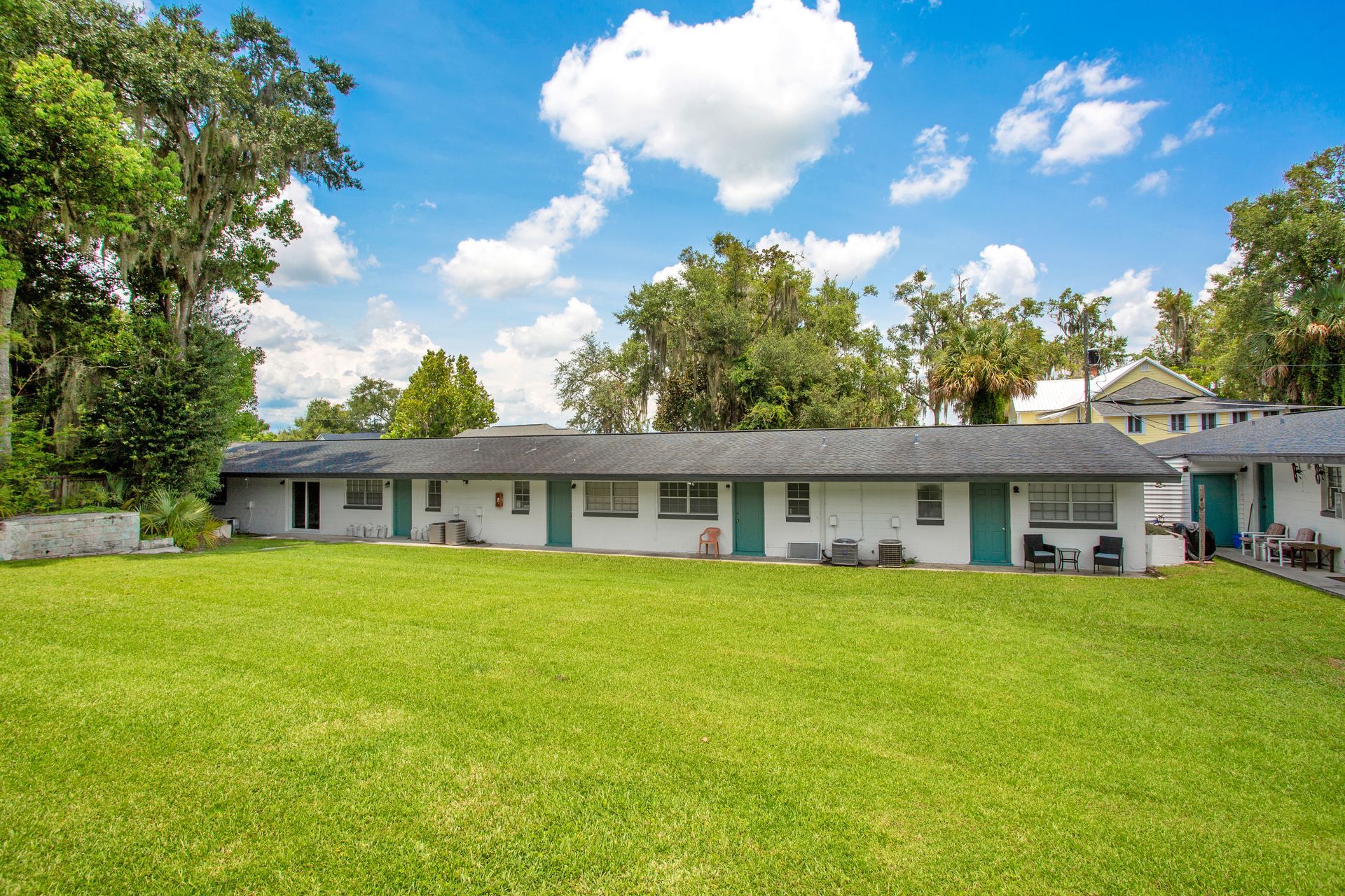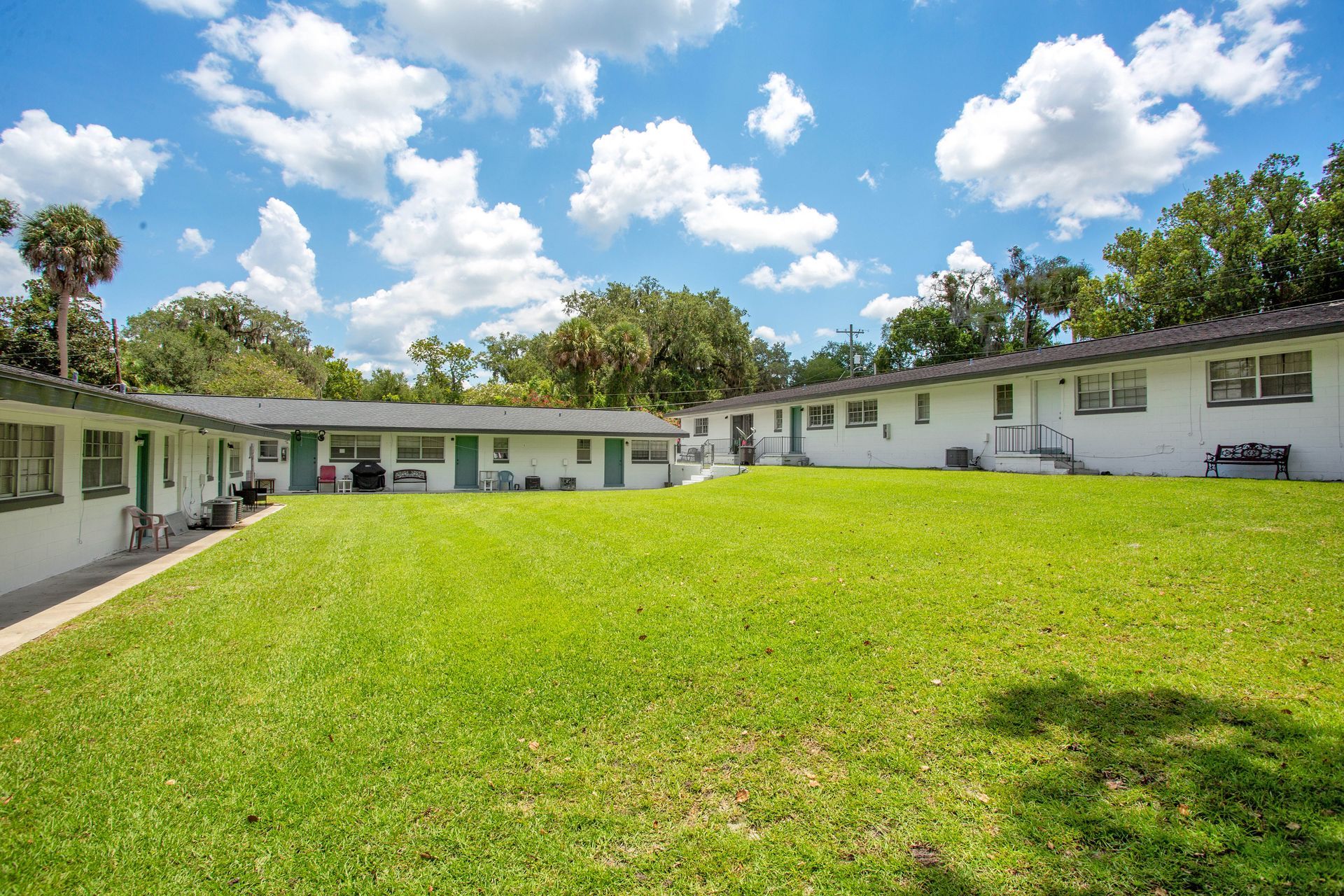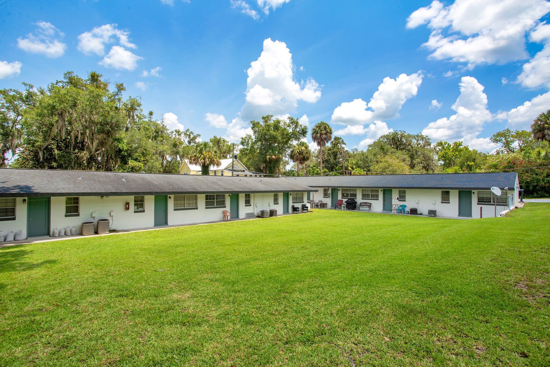 The Gordy's defining architectural feature is its private central courtyard — a large grassy space enclosed by the community's single-story buildings, creating an intimate outdoor environment that belongs exclusively to residents. The courtyard is the hub of community life at The Gordy: it houses the outdoor kitchen with covered seating, the fire pit, and the central lawn that gives the community its open, resort-like feel. In a city where most apartment communities either have no meaningful outdoor amenity or a small balcony, The Gordy's private courtyard is a genuine differentiator. Select apartment homes feature sliding glass doors that open directly onto the courtyard lawn — creating a seamless indoor-outdoor living experience that's especially valuable in Ocala's climate for most of the year.